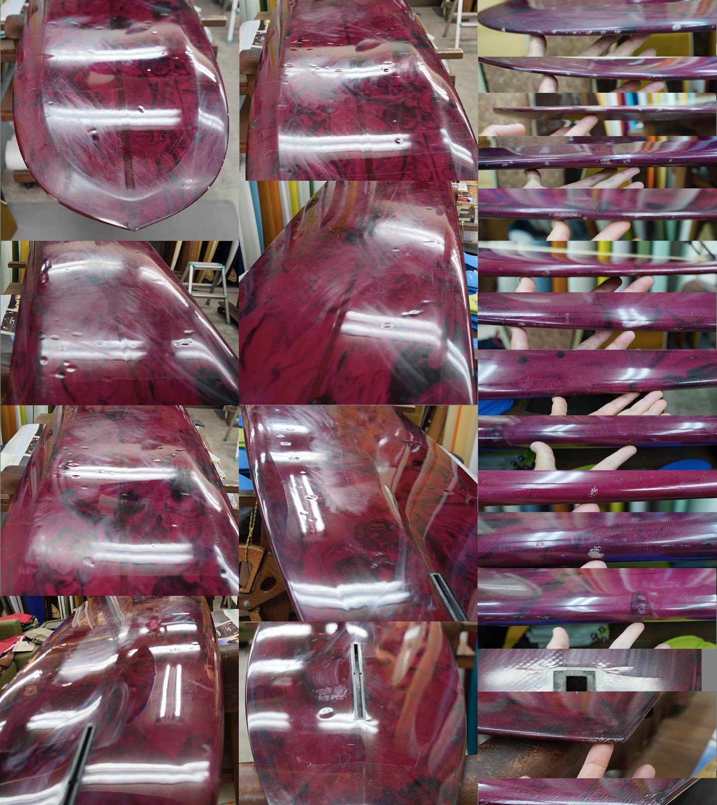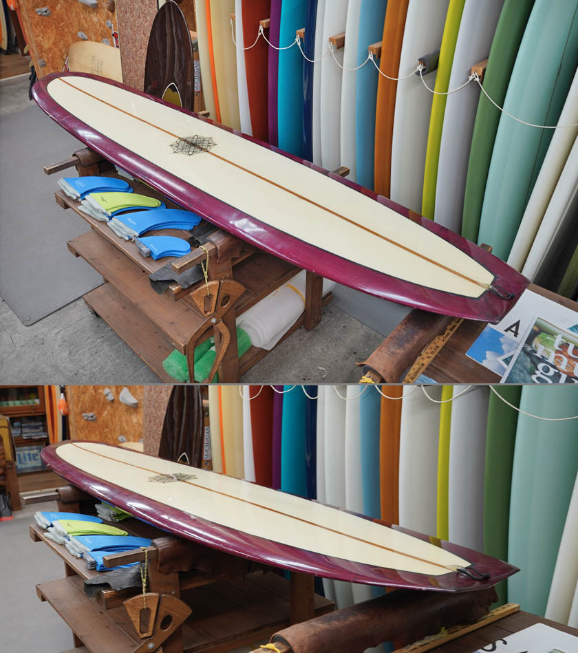 ユーズド、フォレスト・ミンチントンの9’1”ハイパフォーマンス・モデルです。EPS&エポキシの軽量で丈夫な作りのボードです。デッキには画像のような楽しんだ分だけのsフットマーク、そのほかリペアー歴や、小さなあたりなど見受けられるコンディションでしょう。プラグなどに経年による色シミのような箇所もあるコンディションでしょう。フィンセットの付属はありません。