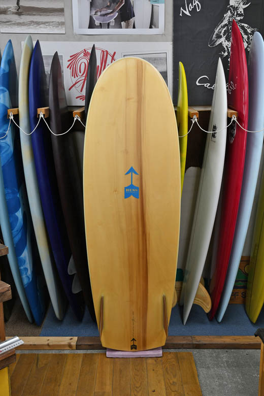 ユーズド、へすのみにシモンズ系シェイプになります。こちらはフルウッドの凝った作りのものではなく、EPSの両面にウッドのパネルを張った仕様になります。ボードウェイトなどからこちらの方が乗りやすいという方も多いとか。ボードはエポキシの性質上色焼けがしっかり見受けられますが、逆にデッキのフットマークは波を打っている程度でほとんど見受けられない感じでしょう。レールとノーズにはリペアー歴があり、ノーズのクリヤー部分は白く色付けして目立たなくしてあります。