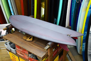 black wood stringer, white resin pinline, leash cup, future quad plug.