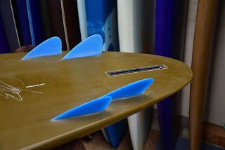 deck & fin patch, glass leash loop, glass on wood twin fin.