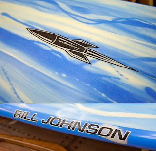 ユーズド、ビル・ジョンソンのショートボードです。テール形状がユニークな個性的なシェイプ・デザインですね。デッキには画像では少しわかりにくいですがフットマークが少々見受けられます。そのほかレールにあたりやノーズにセルフリペアー、ボトムにマイナーな凹みなどが見受けられるコンディションでしょう。画像のフィンセットが付属してこのプライスです。