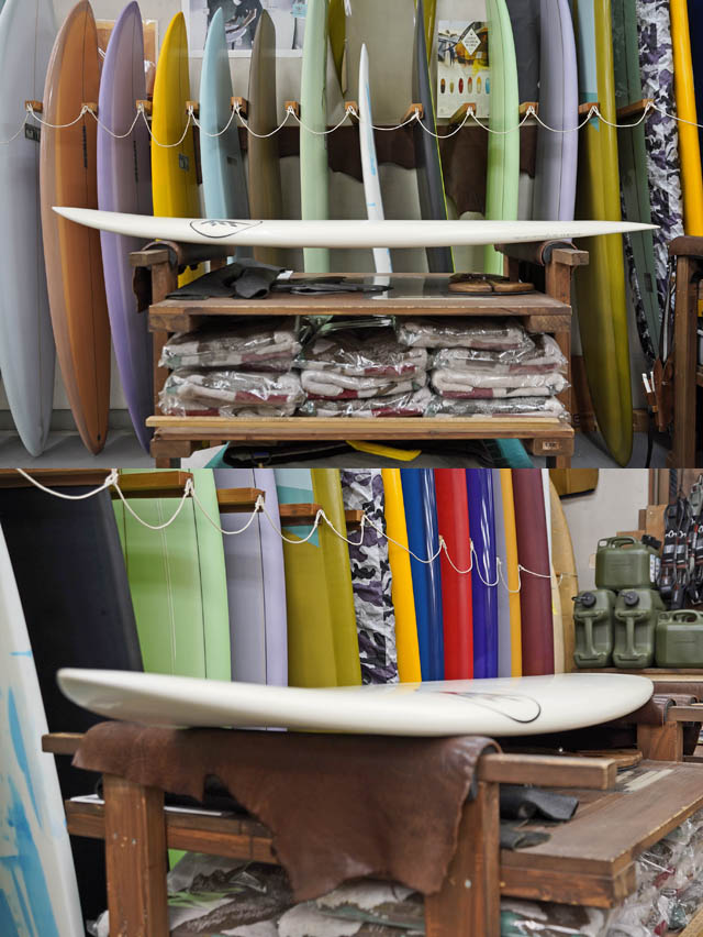 キャプテンフィン社タイラーウォーレンのツインです。こちらはチップに向けてレイクを取りながら細くなっていく形がユニーク。見た目同様に乗って面白そうなツインですね。