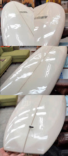土曜の早朝は昨日より潮の影響かロングライドできる感じではないのですが、まあそれでも結構できる感じ。今朝はフルレストアで重〜くなったランスカーソンの9’10”でパドルアウト。オリジナルや復刻版のクラッシック・モデルに比べ、よりナローなピンテールと思いっきりダウンレールのテール。最初乗った際は数本手こずった記憶がありますね。今ではそれほど気にする事なく乗れるのですが、テイクオフの際は早めにパドルしないと初動がずっしりしていたり、ターンはもちろんですが、特にリッピングはコアにしっかりと力を入れて、いつもより早くアクションを起こさないと、ボードが返ってくれません。。。汗 まあ波が波でしたので、サクッと終了でした。