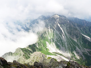 吊り尾根(奥穂からの下り)で眺めた前穂北尾根